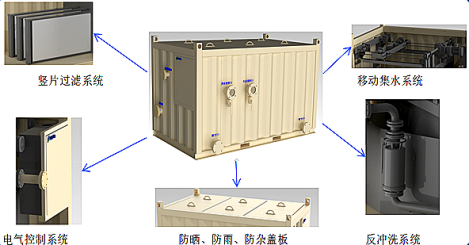 l 集裝箱式瓦楞結構簡單緊湊,附屬設備少,占地面積小,僅為普通快濾池1/4