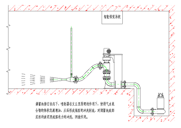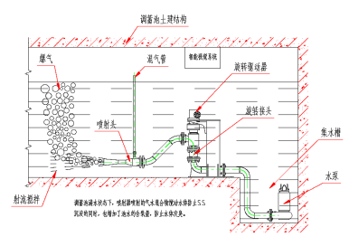 當蓄水池內有一定深度的水體時,智能噴射器在控制系統的控制下,按照設定的程序,在0~260°范圍內定時、定量、定向地往復擺動,通過產生的氣液混合物對調蓄池內地水體進行噴射曝氣,不但降解水中的COD含量,還加速池內污水的氧化清潔,進而最大限度地避免調蓄池產生異味。同時,噴射的氣水混合物對池體具有攪拌作用,使池底的沉積物處于懸浮狀態,利于潛污泵抽排懸浮狀態的污水,可以大幅減少池底淤積物產生(如圖1所示)。