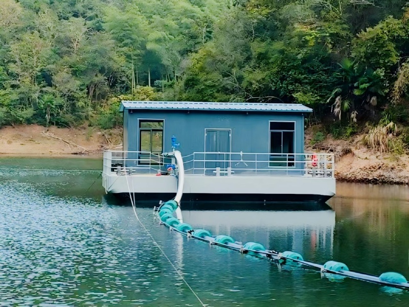 我司直面水域施工的復(fù)雜挑戰(zhàn),肩負(fù)提升飲水安全、強(qiáng)化供水能力、助力水廠升級(jí)的使命,以“質(zhì)量過硬、民生為本”的建設(shè)理念全力攻堅(jiān)。此次承建的取水泵船長10米、寬8米、高4.6米,創(chuàng)新采用約40米長水面漂浮式輸水管路,主要由HDPE浮筒+HDPE管路+不銹鋼金屬軟管的取水工藝,整套取水系統(tǒng)可完全漂浮于水面,隨船體及水位升降自動(dòng)調(diào)整,兩端不銹鋼軟管更能適配船體小范圍晃動(dòng)與搖擺,確保各類水位條件下取水的穩(wěn)定性與安全性,徹底破解水域取水的環(huán)境適配難題。